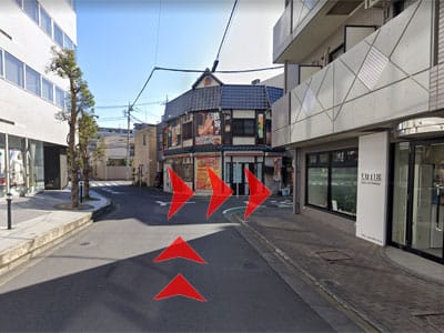3 横断歩道を渡りY字路右側の道を進んでください。